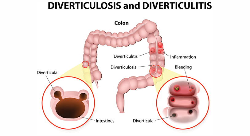 Diverticulosis se refiere a la presencia de pequeñas bolsas o sacos que crecen hacia fuera (llamados divertículos) y pueden desarrollarse en la pared del tracto gastrointestinal. Si bien puede haber divertículos en cualquier parte del tracto digestivo, su presencia es más común sobre el lado izquierdo del intestino grueso, zona conocida como colon descendente y sigmoide.